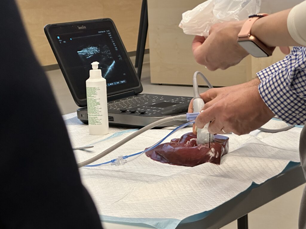 Simulace probíhala na vepřových játrech, jejichž struktura velmi dobře napodobuje chování lidské tkáně při termální ablaci. Lékaři tak měli možnost sledovat šíření tepelné energie v reálném čase, osvojit si práci s ablační jehlou a diskutovat jednotlivé postupy přímo během výkonu.